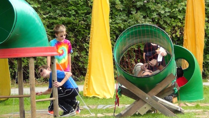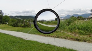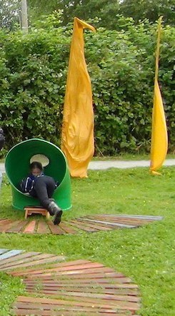 In ‘3 Points of Perspective’, Tiki Mulvihill and Fae Logie worked together with repurposed finds of old fencing and large green tubes cast off from a playground. What appears is a whimsical and participatory art installation with hidden viewpoints, ‘seeing’ the landscape through a different lens.