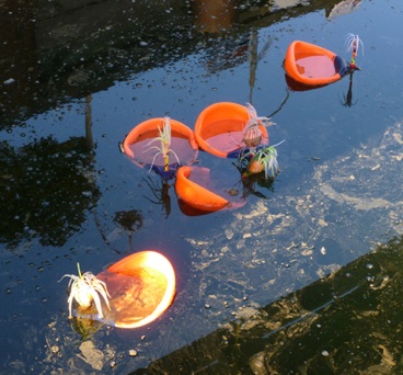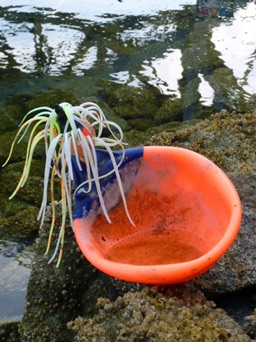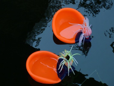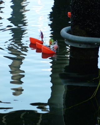 Sheltered along the shoreline, these eccentrically coloured forms flow and sway at the mercy of False Creek tides and currents. Made from re-purposed objects of fishing and boating, (floats, lures, anchors, etc.) this work speaks of the peculiarities of ordering nature through human intervention or alternatively ordering cultural objects through mimicking natural phenomenon.