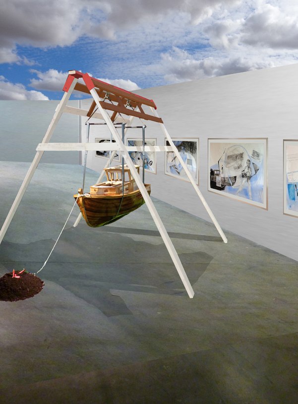 Derived from the fictional premise of a man’s desire to escape from land to sea, the installation ‘Landlocked?’ pivots around an intentionally ‘close-to-completion’ boat, cradled beneath a roof frame hung from the ceiling. This quarter-scale vessel, crafted from re-purposed materials and hardware, anchors to a small pile of earth nestled upon the gallery floor. Paralleling these sculptural components six collage-like drawings derived from ‘re-purposed imagery’ reference the overlap between daily life and one man’s obsession with building an escape vessel. These images connote plans or blueprints from life and construction.